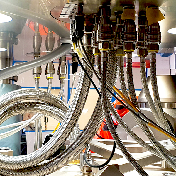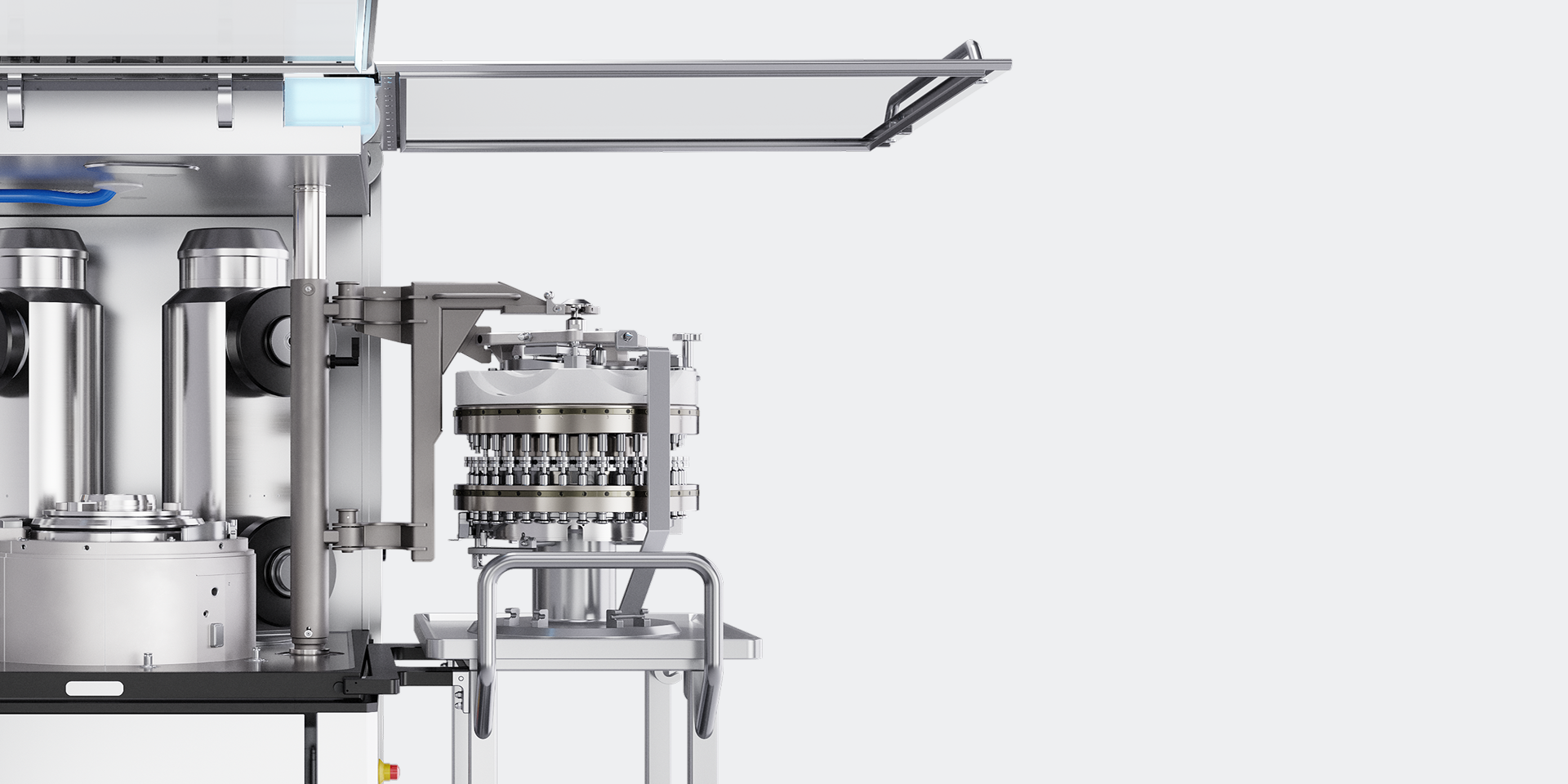The XL 400 MFP offers the flexibility to produce single-, bi-, tri-layer, tablet-in-tablet, and microchip-in-tablet product formats. The machine is preconfigured to permit the installation of a wide range of conversion kits consisting of compression roller, feeder, and cam track modules that permit a “plug and produce” approach for maximum versatility and efficiency.